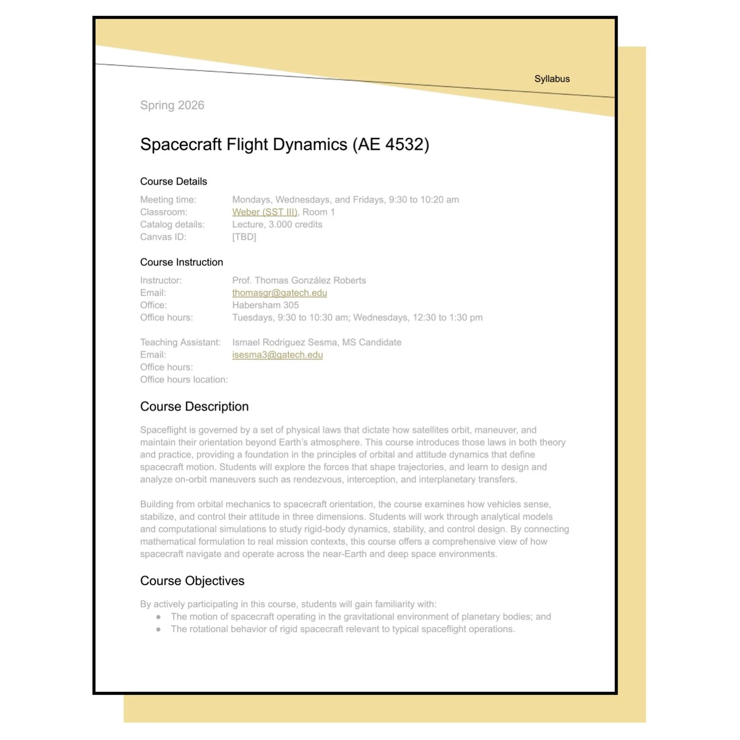 Download the Spring 2026 Spacecraft Flight Dynamics syllabus here. 10 pages.